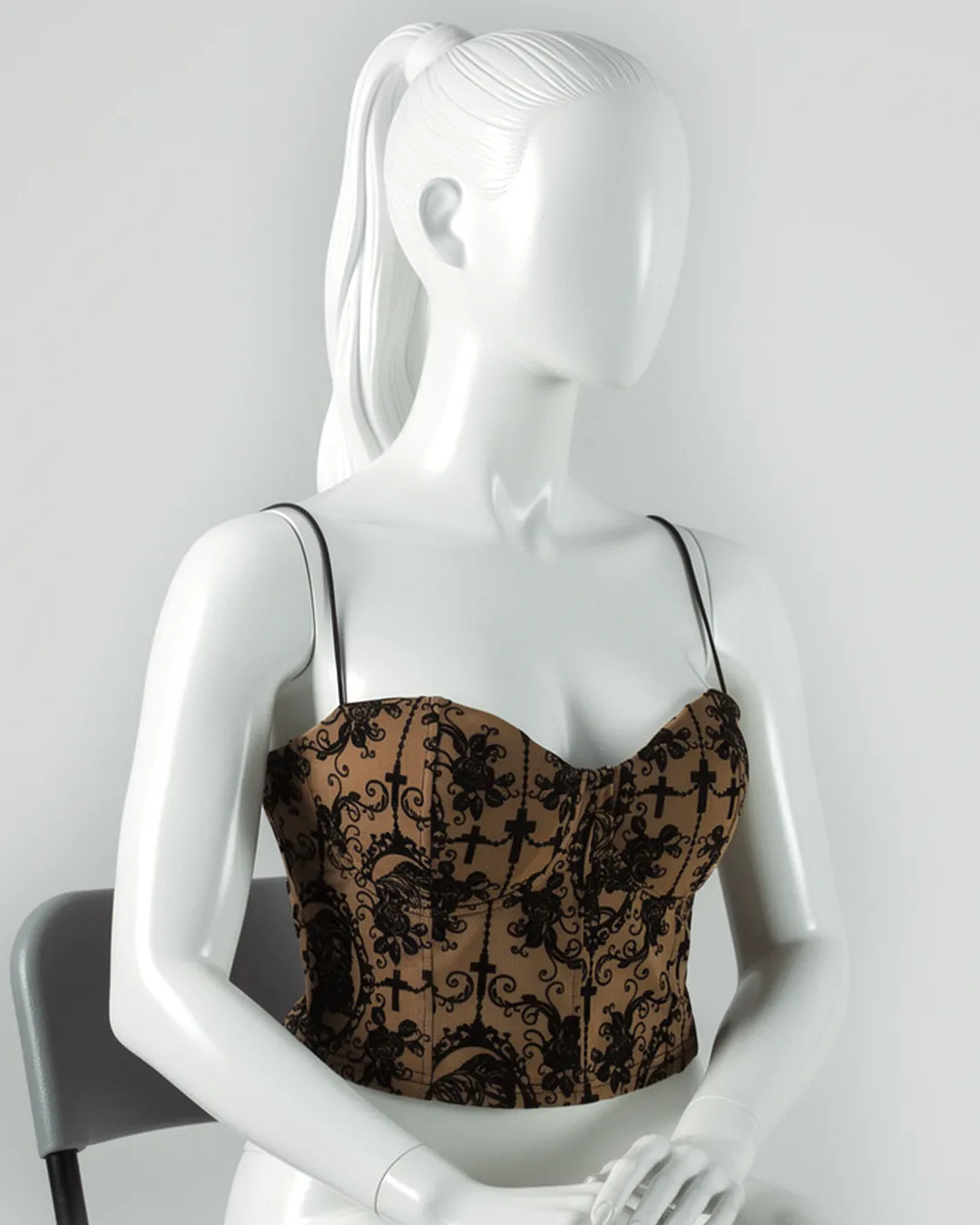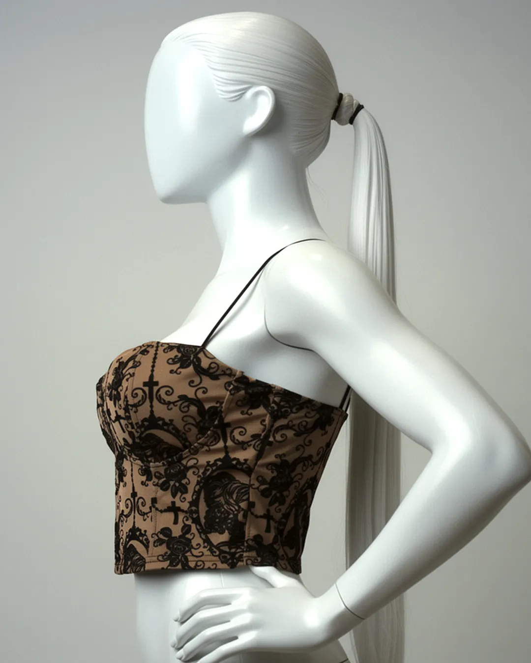 Embroidered / printed detail: Delicate all-over motif on a solid base color adds a gothic-chic, eye-catching look that pairs easily with jeans, skirts or leather pants.