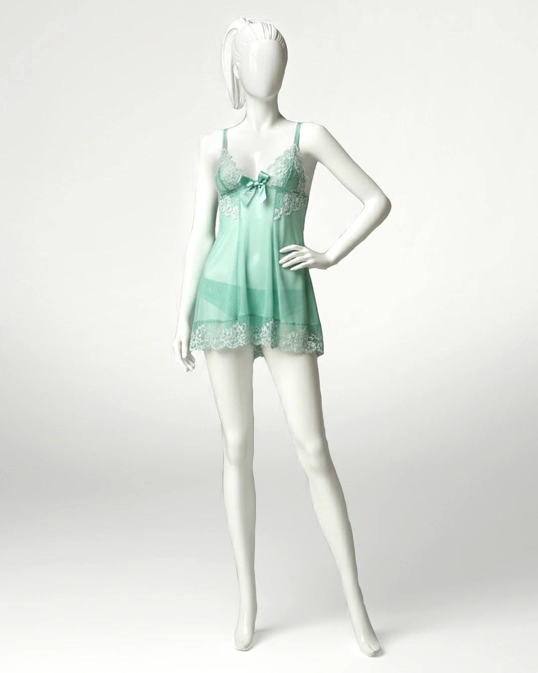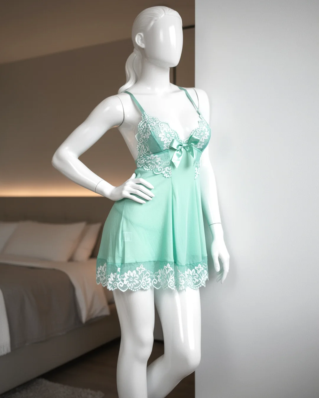 The neckline is beautifully framed with delicate lace edging and a satin bow accent, adding a feminine touch to the playful silhouette. The printed pattern enhances the stylish finish while maintaining softness and comfort.