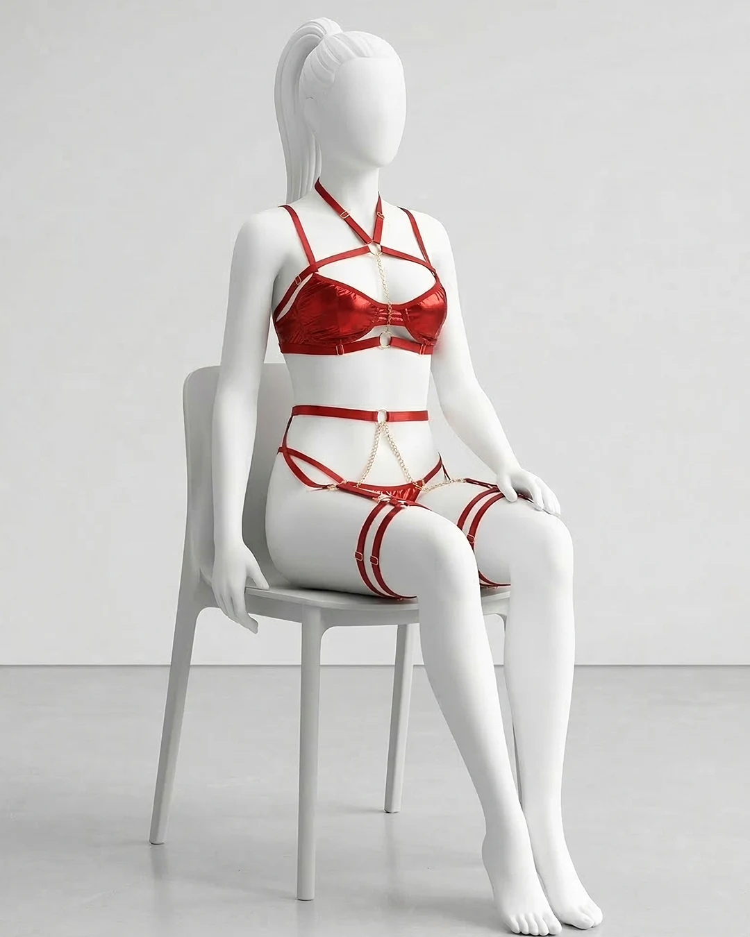 CHAIN NECK & WAIST DETAIL – Gold-tone chain accents run from the center of the bra to the neck ring and across the waist, creating a striking “harness” effect that highlights your curves and adds an edgy, fashion-forward touch.