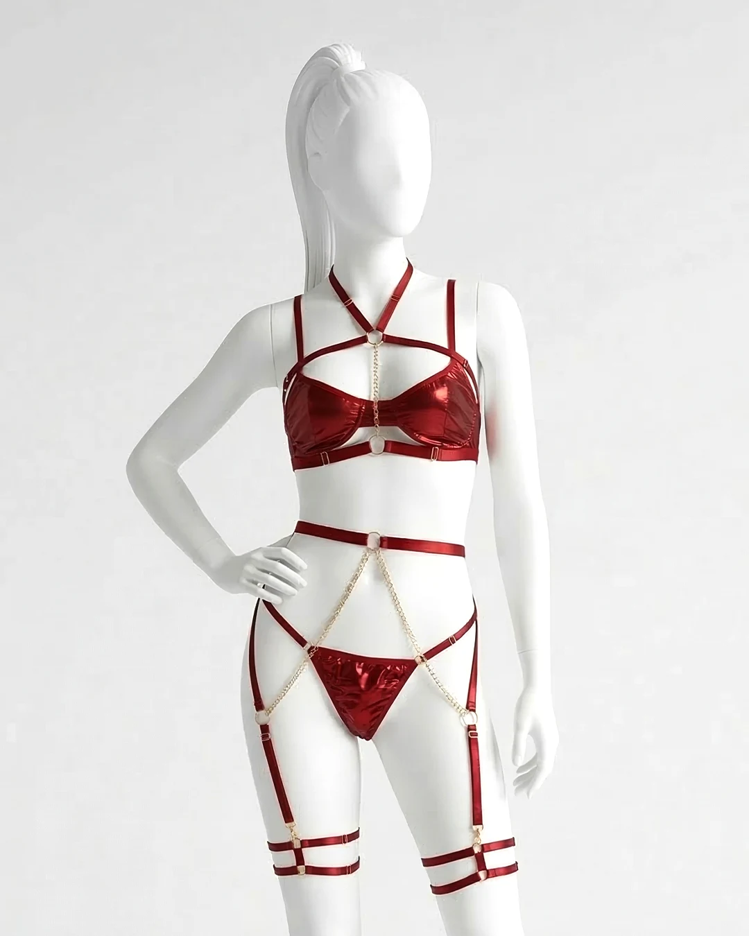 BOLD 3-PIECE SET – Turn heads in this ultra-sexy three-piece lingerie set featuring a structured bra top, high-cut thong and matching strappy leg/waist harness for a coordinated, high-impact look.