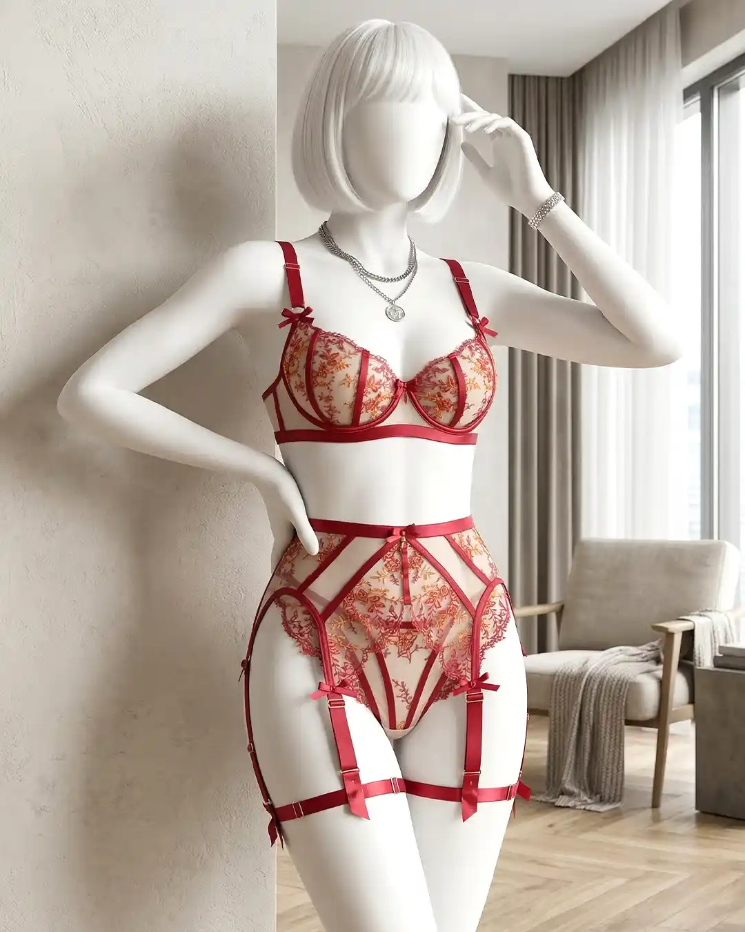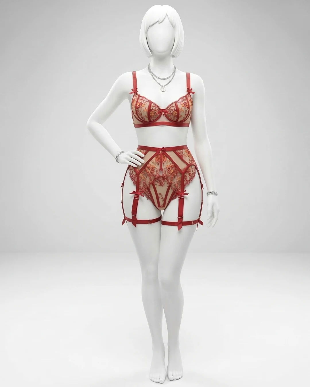LUXE FLORAL EMBROIDERY – This striking red lingerie set is crafted with intricate flower embroidery over sheer mesh, giving it an expensive “heavy craft” look that’s perfect for special occasions.