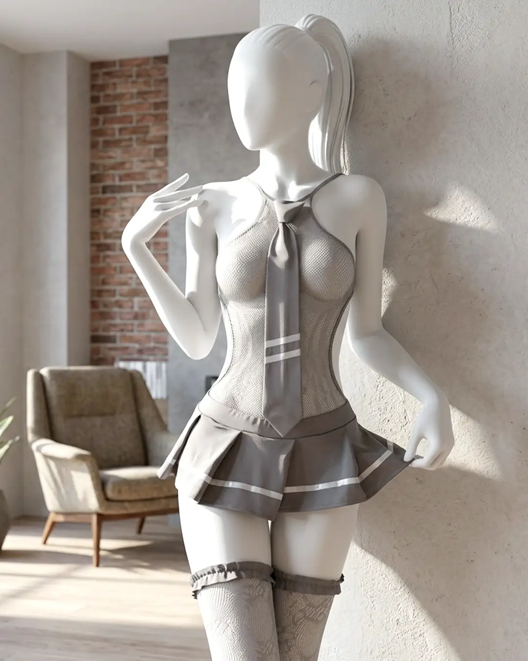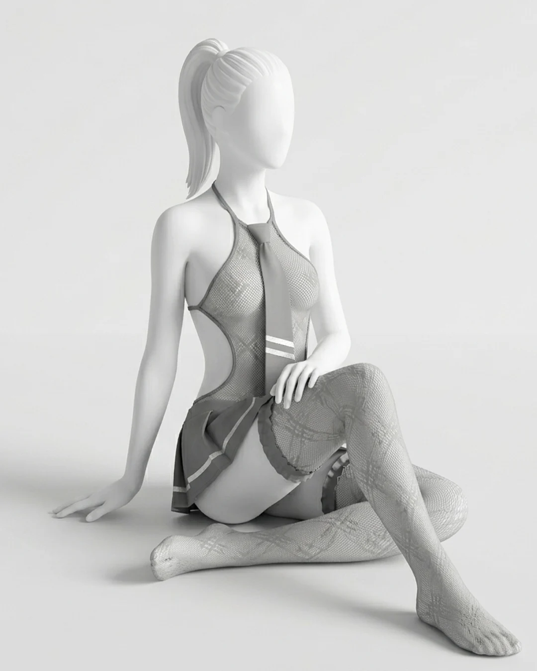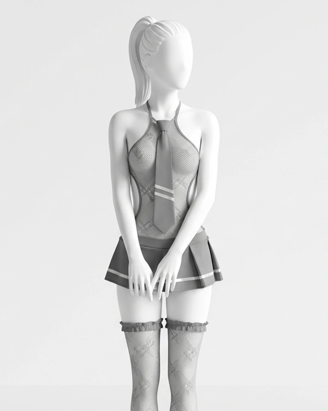 UNIFORM-INSPIRED COSPLAY LOOK – This sexy lingerie outfit features a halter mesh bodice with an attached pleated mini skirt and matching tie detail on the front, creating a playful, uniform-inspired cosplay style for adult women.